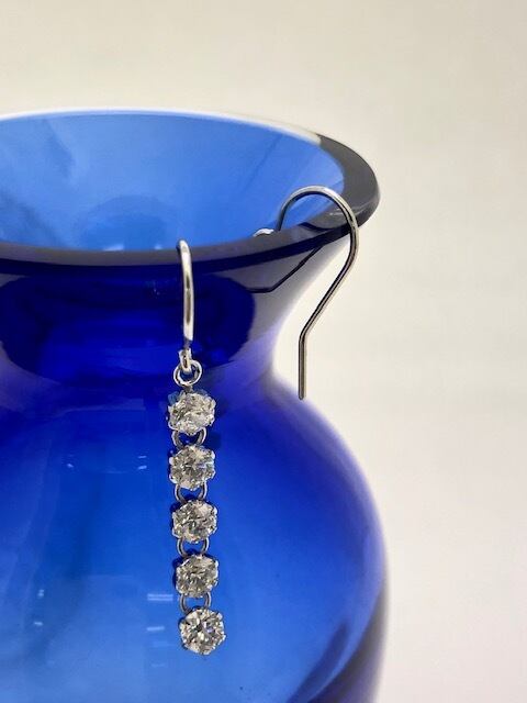 ひとつひとつのパーツがそれぞれ組み合わされている大定番のスリーストーンピアス。0.50/0.50カラット相当のボリュームがあり耳元でエレガントに光り輝きます。輪郭を損なわないようにツメを目立たないようにセッティングしているが、6本のツメで石留されているので安心です。